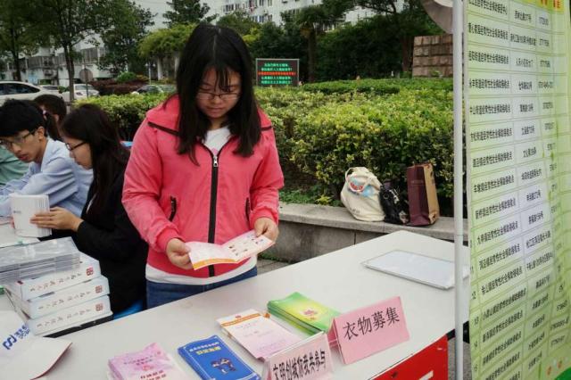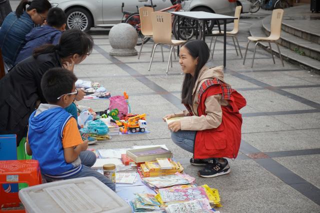 志愿者们分别负责签到表和物资捐赠登记表以及物资义卖。负责签到和物资捐助登记的同学一丝不苟,认真记录。负责物资义卖的同学由于一开始经验不足,致使摊位较冷清,但在主办方阿姨的带领下,她们逐渐融入了这项工作,做得越来越顺手,来摊位光顾的人也越来越多,同学们可是收获了不少成就感。