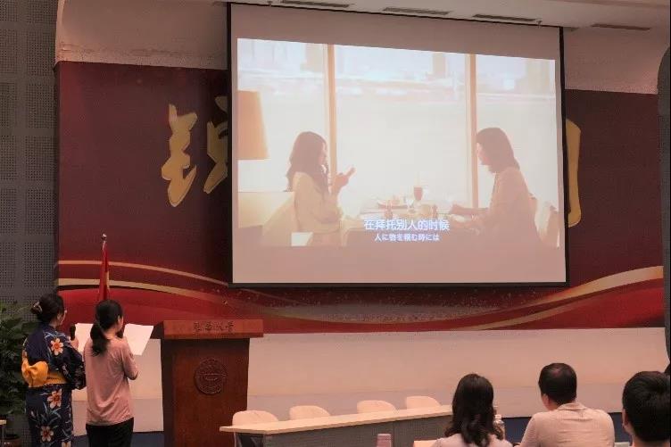 决赛暨闭幕式在大家的掌声中拉开了帷幕,首先出场的是大二年级参加配音大赛的三组同学,经过初赛的筛选,6名同学登上了决赛的舞台。他们赛前精心准备,将日剧中的「名場面」完美再现。司天宇同学的精湛表演和标准发音,给大家留下了深刻的印象。