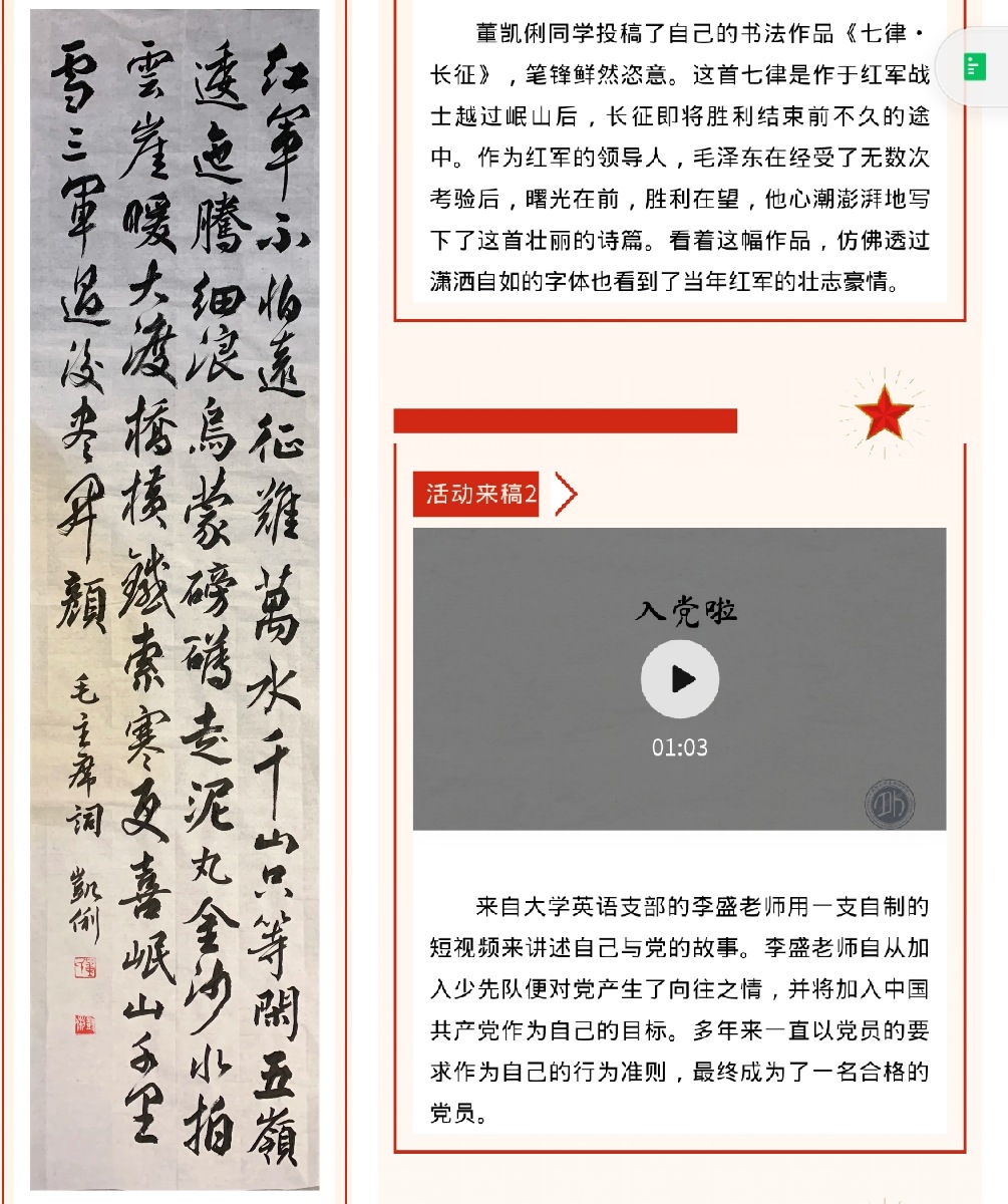 激昂发声,唱响党史学习主旋律”。公司党委坚持紧扣“为什么学习党史”“学什么党史”“怎样学习党史”三大问题,还充分利用新媒体,打造极具专业特色的虚实结合党史学习平台,面向全院师生开展红色征集令——我与党的故事,使党史文化理论更具有吸引力,促进党史文化真正实现“入脑、入心”,坚持做好公司师生党史学习教育的“传声筒”;依托“东华外院新闻站”公共号开辟党史学习微专栏,易班平台开展“党史故事我来讲”等丰富多彩的活动平台,坚持党史学习教育的引领地位,以此发挥出党史学习教育的强大育人功能;通过利用互联网创设教学情境,打造“互动式+体验式”党史学习新课堂,将党史融入公司全员、全程、全课程育人的大格局,打通党史教育“最后一公里”,将党史的滋养转化为全院师生的政治本色,奋斗的行动动力。