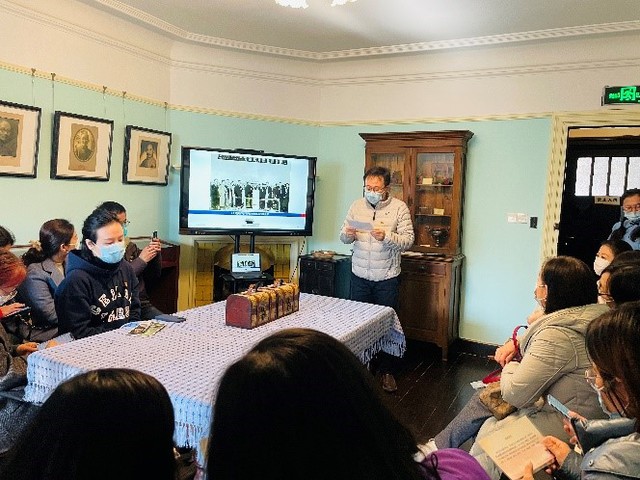 活动采取“情景党课”的方式,由专业讲解员扮演蔡元培的女儿及北大女员工,结合现场的物品道具,讲述他的家庭生活及员工眼中的蔡董事长。我们一行20人则分别扮演来访者、组长、讲述者、参与者,还原一些经典场景,共同参与演绎历史小故事。