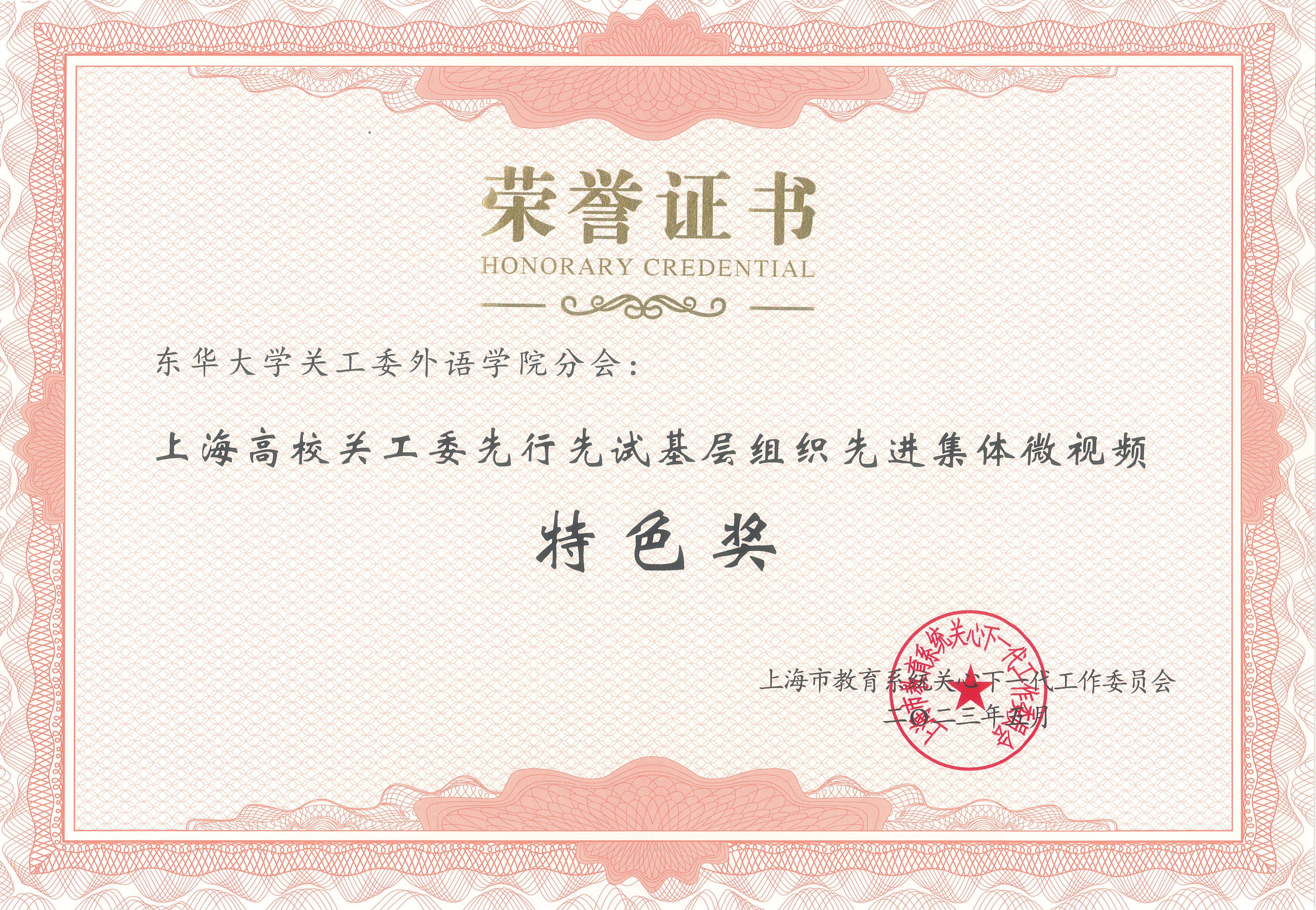 近日,上海市教卫工作党委召开2023年上海市教育系统关工委推进基层组织建设暨表彰会,公司荣获多项荣誉。外语学院关工委获评上海市教育系统关工委先行先试基层组织“先进集体”及微视频“特色奖”,严鑑华老师获评“先进个人”。