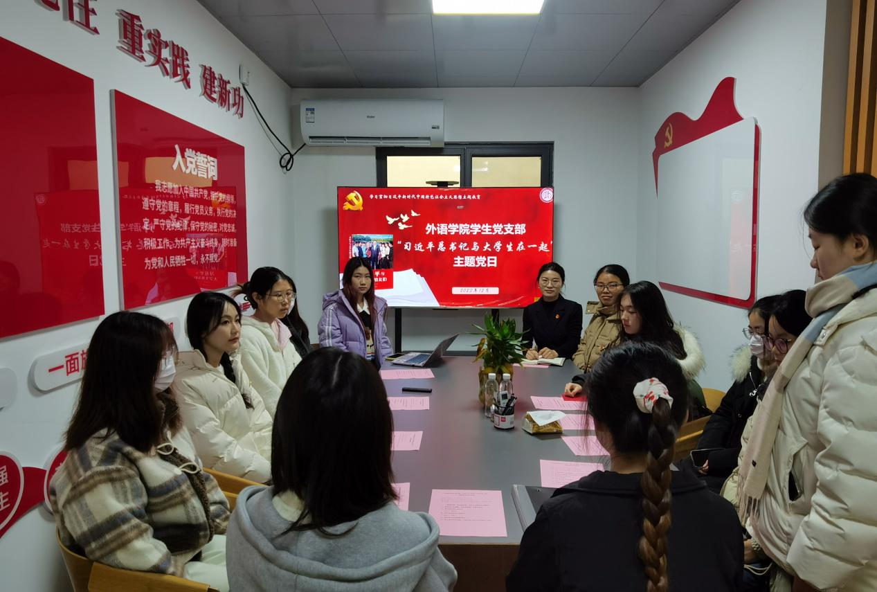 本科生党支部书记黎萍为党员讲授《习近平总书记与老员工在一起》专题党课,时代赋予青年的使命极其光荣,责任也尤为重大。新时代中国青年应当牢记习近平总书记的嘱托,坚定理想信念,站稳人民立场,练就过硬本领,投身强国伟业。党员李依璇、彭佳欣、董晓妍也结合《习近平与老员工朋友们》一书,向党员重点介绍和分享“习近平总书记鼓励老员工努力成长为堪当民族复兴重任的时代新人”、“习近平总书记提倡年轻人要‘自找苦吃’”、“习近平总书记嘱咐我们‘在社会的广阔天地大显身手’”三个篇章,并结合自身情况呼吁青年党员不负党和人民的殷切期望,在青春的赛道上跑出当代青年的最好成绩。