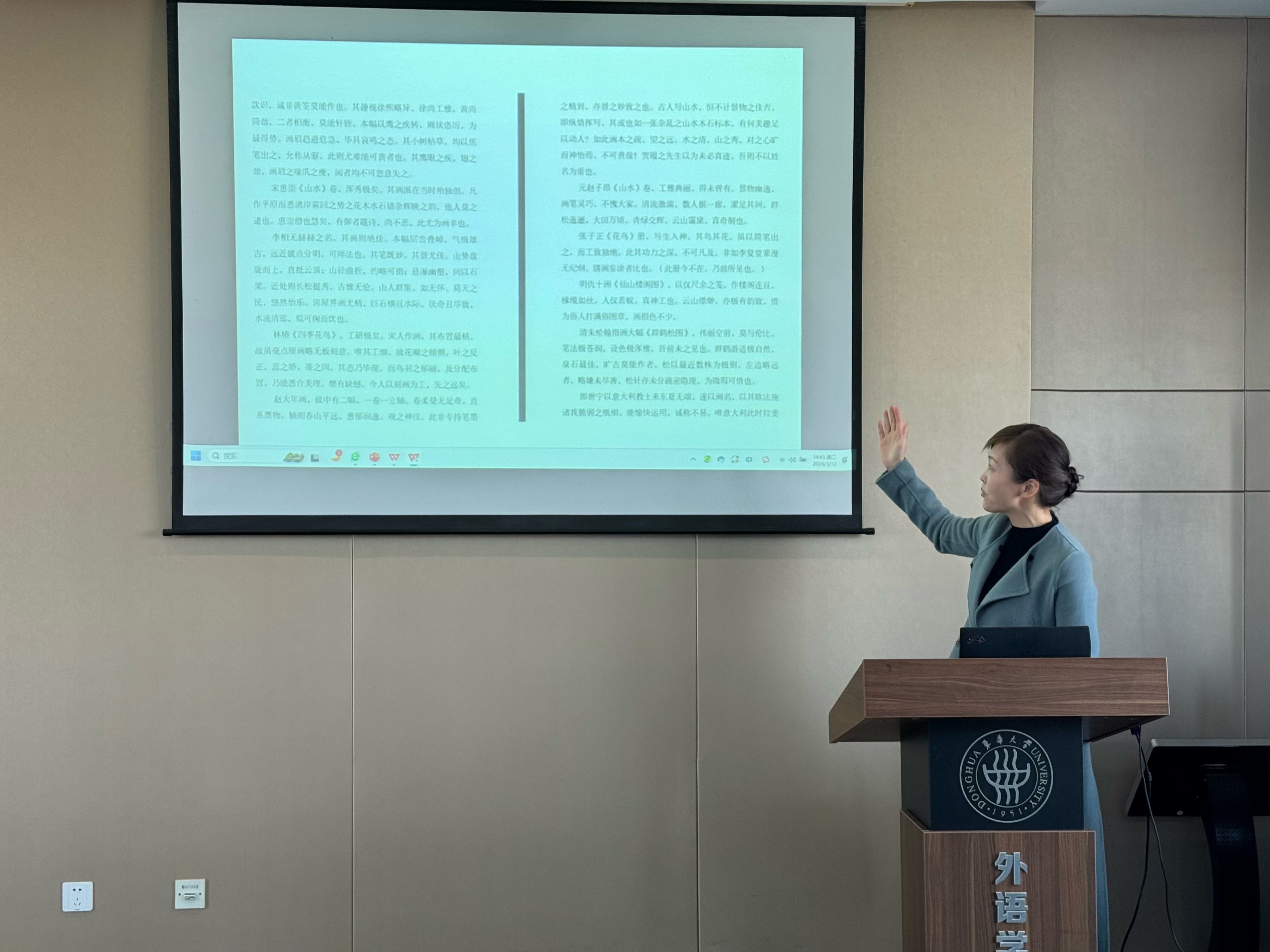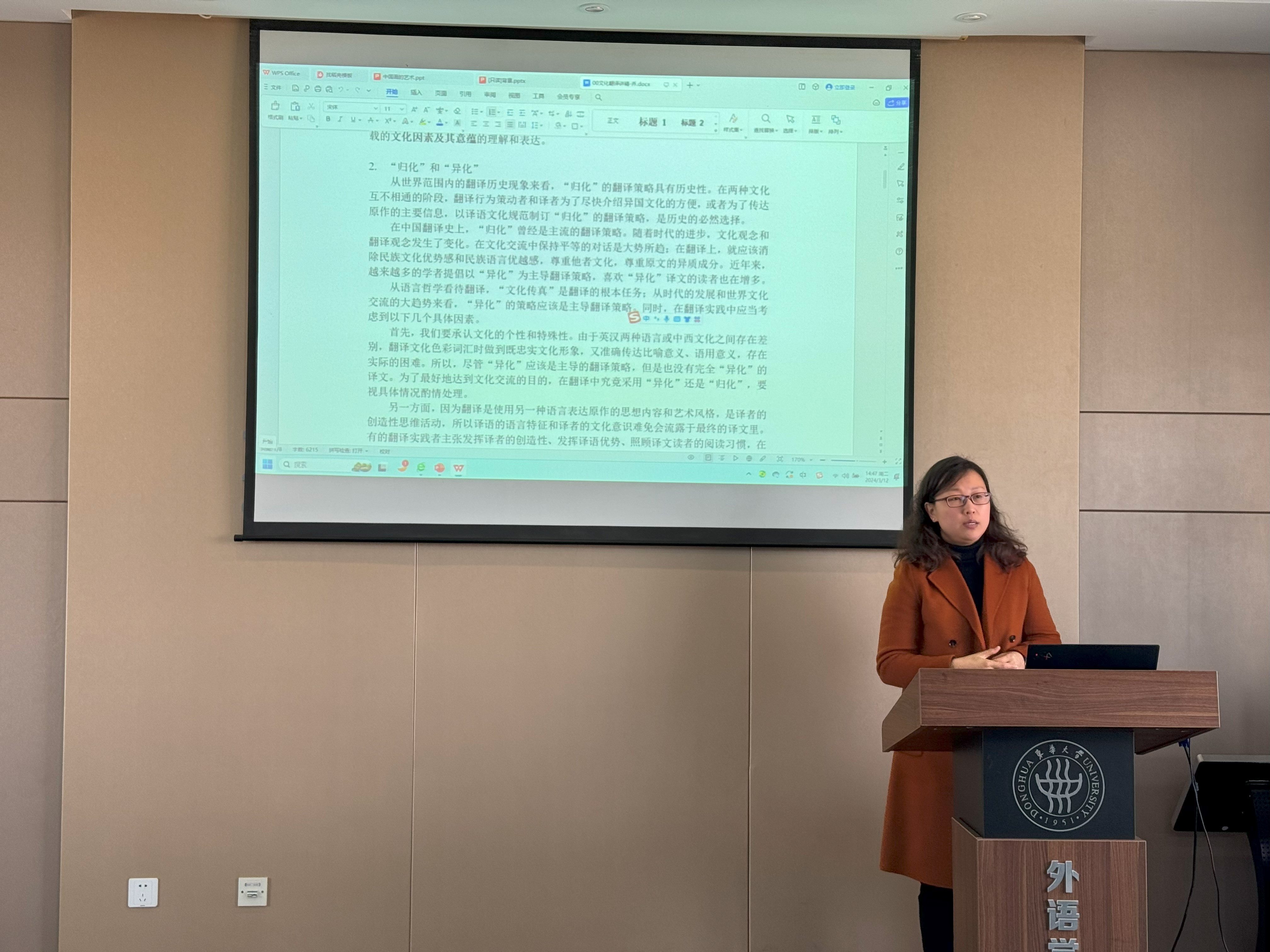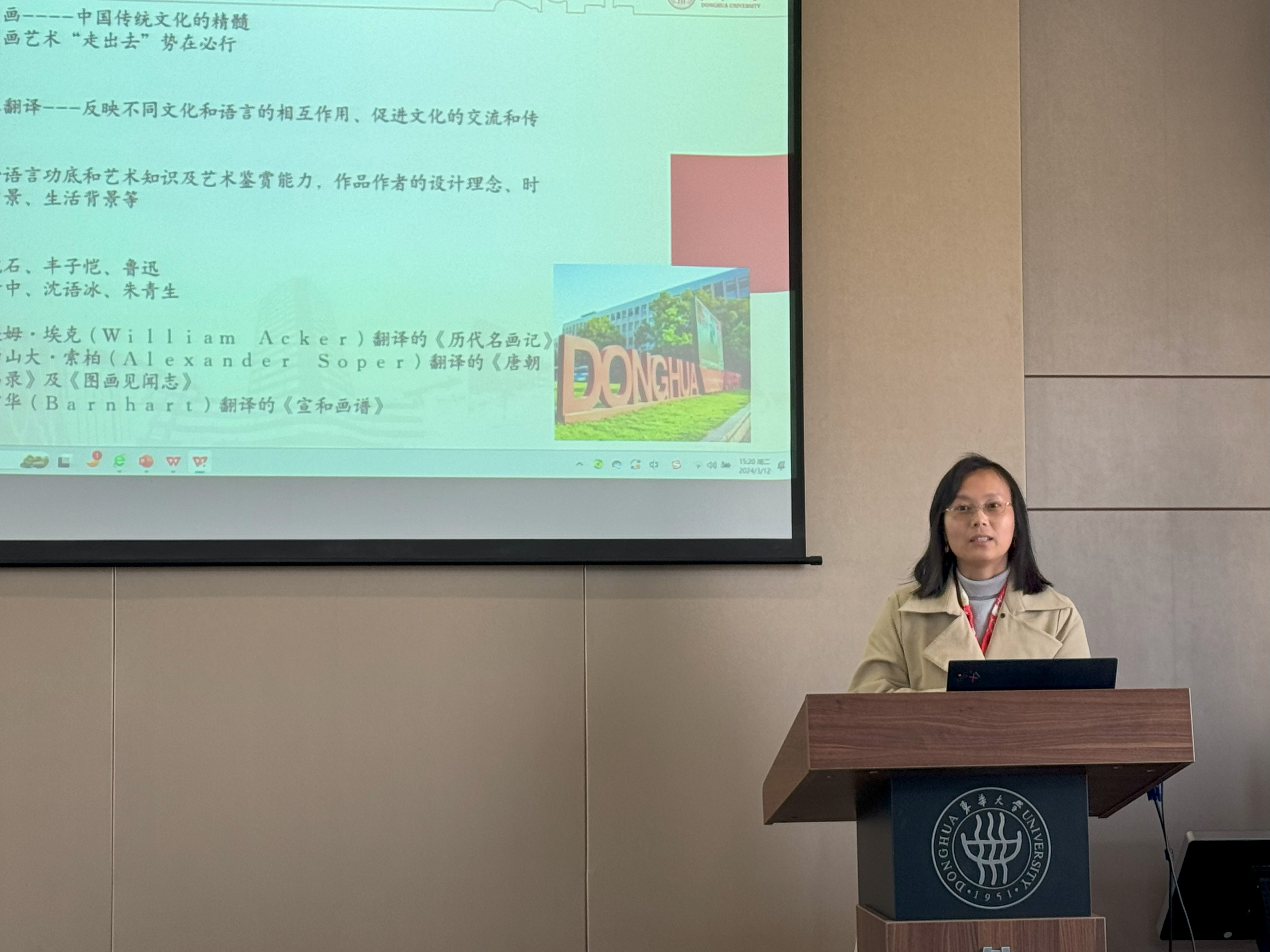 张曦首先对翻译项目做了介绍,《中国画的艺术》一书蕴含着丰富的中国历史文化,其英译对中国文化的国际传播具有积极意义。英语系副主任乔雪瑛、翻硕导师杨捷、张曦先后围绕文化翻译、艺术翻译、译后编辑等方面给员工分享了宝贵的翻译经验。