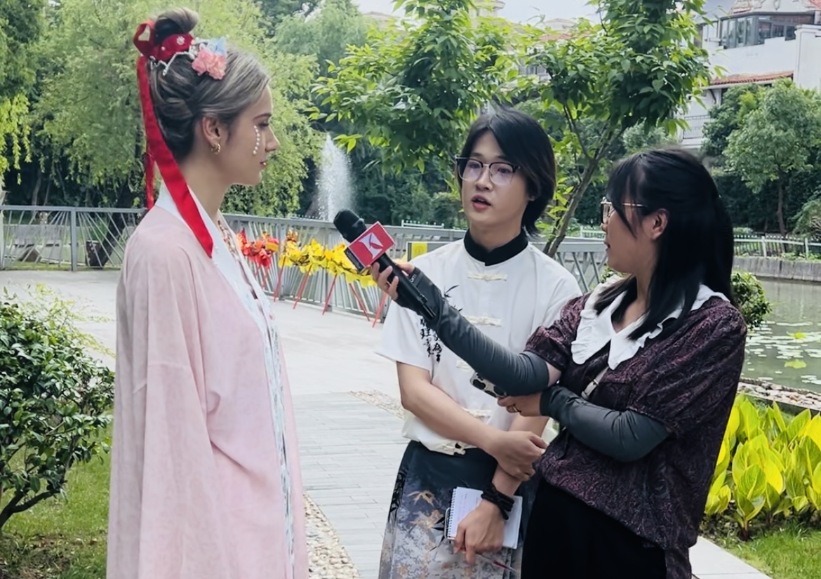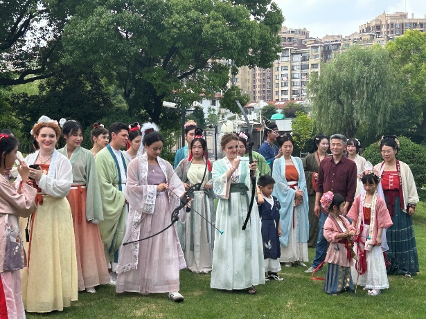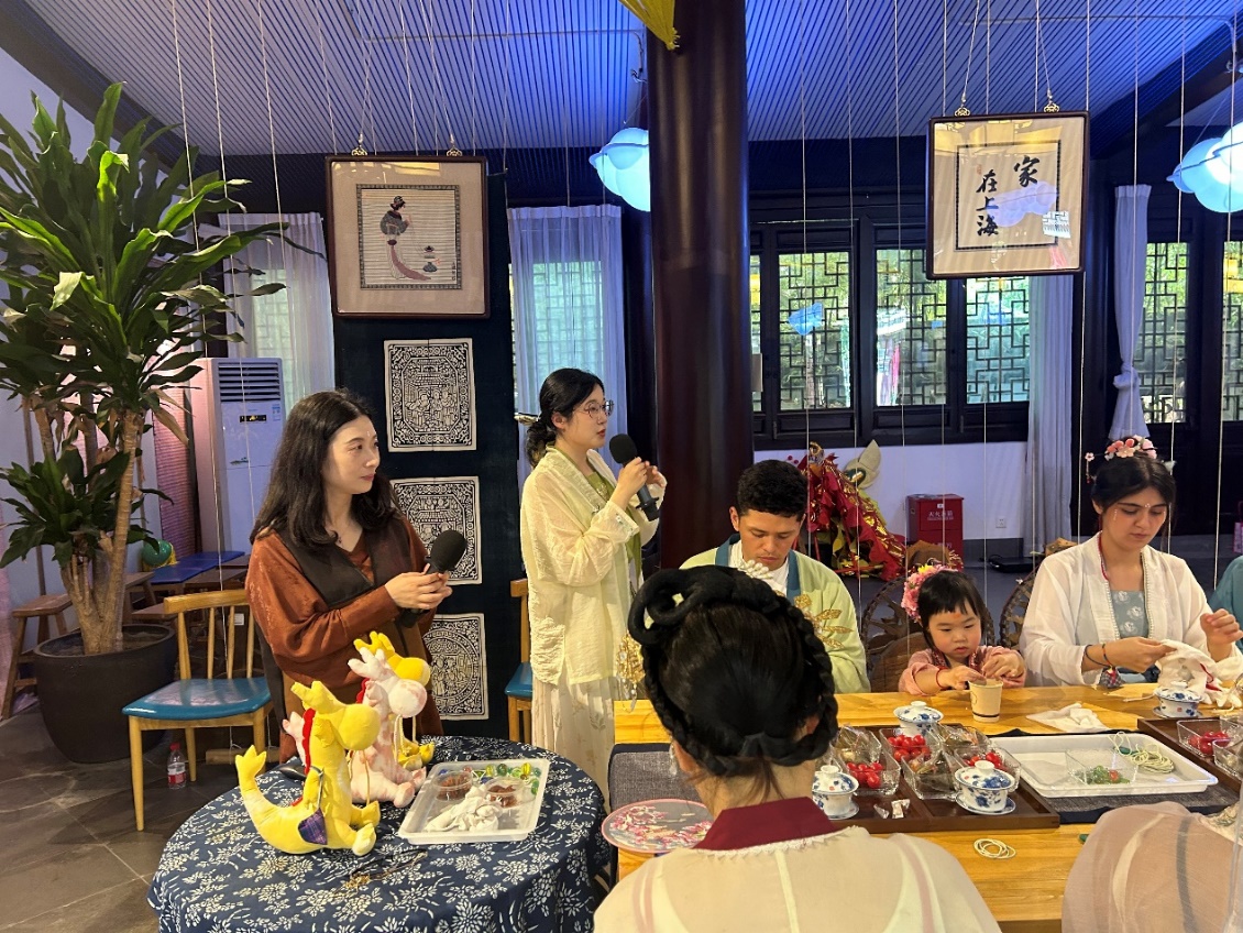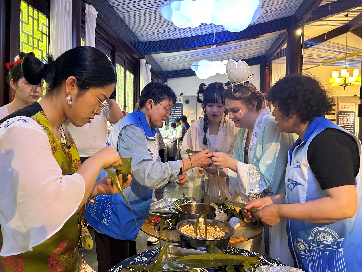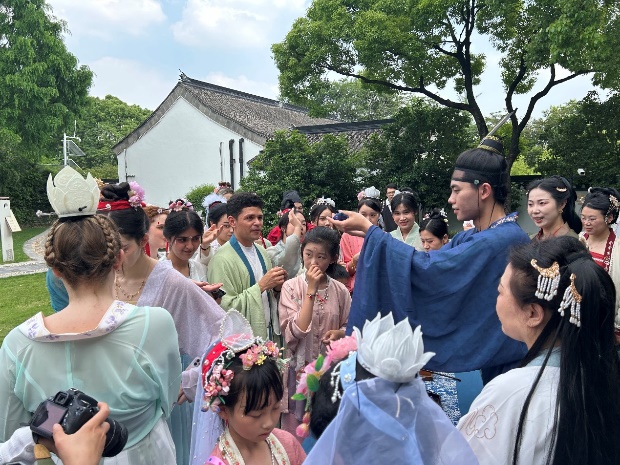 6月8日端午假期首日,williamhill中国官网入口来自俄罗斯、土耳其、哈萨克斯坦等8国的职工身着宋制汉服,于徐汇区黄道婆纪念公园沉浸式游园,共同体验了端午民俗活动和传统非遗活动,williamhill中国官网入口英语系志愿者全程为外国友人口译,积极参与了中国传统文化的国际传播实践。